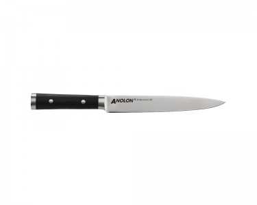 Any way you slice it, the Anolon Cutlery 8-Inch Japanese Stainless Steel Slicer Knife and Knife Sheath are prepared to help make memorable culinary creations. This sturdy slicing knife features a stamped, full-tang blade crafted from top-quality Japanese stainless steel for superior cutting performance. It boasts indentations in the sides of the blades that create air pockets to reduce drag when carving a juicy pork loin, slicing Fontinella cheese or halving a sweet ambrosia melon. The handle is constructed for long-lasting stability, elegance, and comfortable grip, with stainless steel rivets and bolster that elegantly and solidly connect them to the blade for optimum strength and beauty. A stylish knife sheath protects the blade as well as a chefs fingers between uses, and this gourmet slicer knife complements many other professional-quality items in the Anolon collections. Slice through foods with ease using the versatile Anolon Cutlery 8-Inch Japanese Stainless Steel Slicer Knife with Knife Sheath.